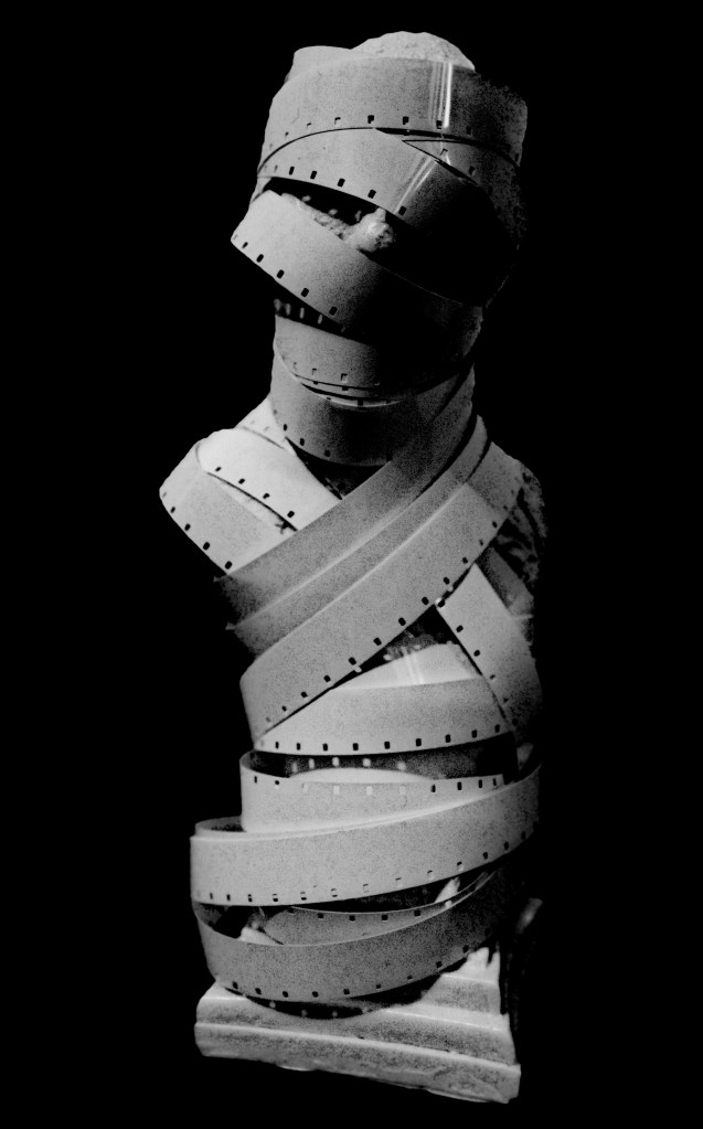 La momie enroulée dans ses amorces de pellicule 16 mm pose une question fondamentale : qu’est-ce qui, de la chair ou de l’image, se décompose le plus lentement ? Le film de famille devient ici un tombeau paradoxal : il préserve les gestes tout en dissolvant leur substance, immortalise des sourires tout en révélant, à chaque projection, leur progressive altération par le grain de l’image. Ce double processus d’embaumement, le corps momifié et la mémoire cinématographique, trahit notre terreur du temps, mais aussi notre vanité : croire qu’en multipliant les enveloppes , bandelettes, photogrammes, nous pourrions suspendre l’entropie un temps est une erreur. Pourtant, la lumière même du projecteur ronge ce qui reste de visage, transformant l’archive en un lent rite de disparition. Ainsi, la bobine tourne comme un sablier : chaque photogramme est un grain de sable qui s’échappe, et ce qui nous regarde depuis l’écran, ce n’est plus la personne, mais son absence méthodiquement mise en scène.