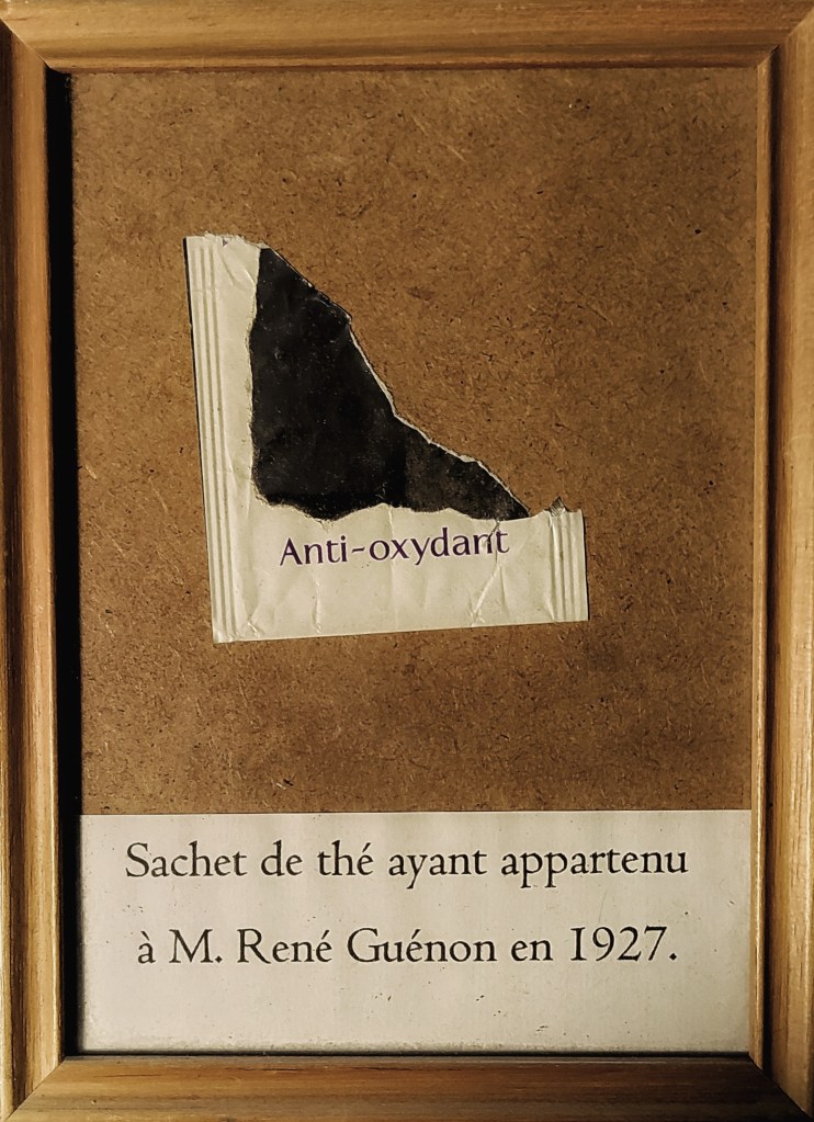 Le cadre cernant le sachet et sa notice opère un glissement de sens, transformant l’objet en véritable manifeste. Le terme « anti-oxydant », c’est une promesse biochimique de conservation, (les antioxydants sont des substances qui aident à protéger les cellules de notre organisme contre le stress oxydatif provoqué par les radicaux libres. Les radicaux libres sont des molécules instables qui peuvent agresser les cellules et leur matériel génétique, ce qui peut entraîner un vieillissement prématuré. Donc ce terme anti-oxydant et sa promesse de conservation biologiques se mue en « anti-occident », cri de ralliement métaphysique oriental. Ce calembour n’est pas une simple plaisanterie, mais le cœur battant de l’œuvre. Il établit un pont direct entre la fonction littérale du sachet de thé : lutter contre l’oxydation des cellules et le projet intellectuel de René Guénon : lutter contre la dissolution spirituelle de l’Occident moderne, qu’il considérait comme un processus de décomposition accélérée du point de vue divin. Donc d’un côté, préserver le corps et ses cellules et de l’autre préserver l’âme et ses aspirations a la sagesse divin. La date de 1927 fait référence à la publication de son ouvrage la crise du monde moderne. L’objet devient ainsi l’allégorie matérielle d’une pensée : de même que l’anti-oxydant préserve le corps du vieillissement, la Tradition, défendue par Guénon, est présentée comme le seul rempart capable de préserver l’humanité de la corruption matérialiste et de l’invidualisme du l’ère moderne. L’oeuvre agit comme une clé de lecture, mais aussi de mensonge, évidemment puisque ce sachet de thé n’a jamais appartenu à Mr Guénon, mais la façon dont il est déchiré temoigne d’une desillusion et nous force à voir dans ce sachet de thé non plus un simple déchet, mais un concentré de combat philosophique, métaphysique contre l’esprit du monde moderne.