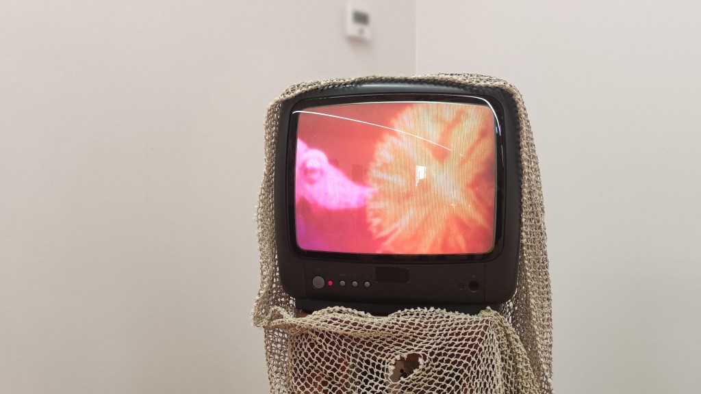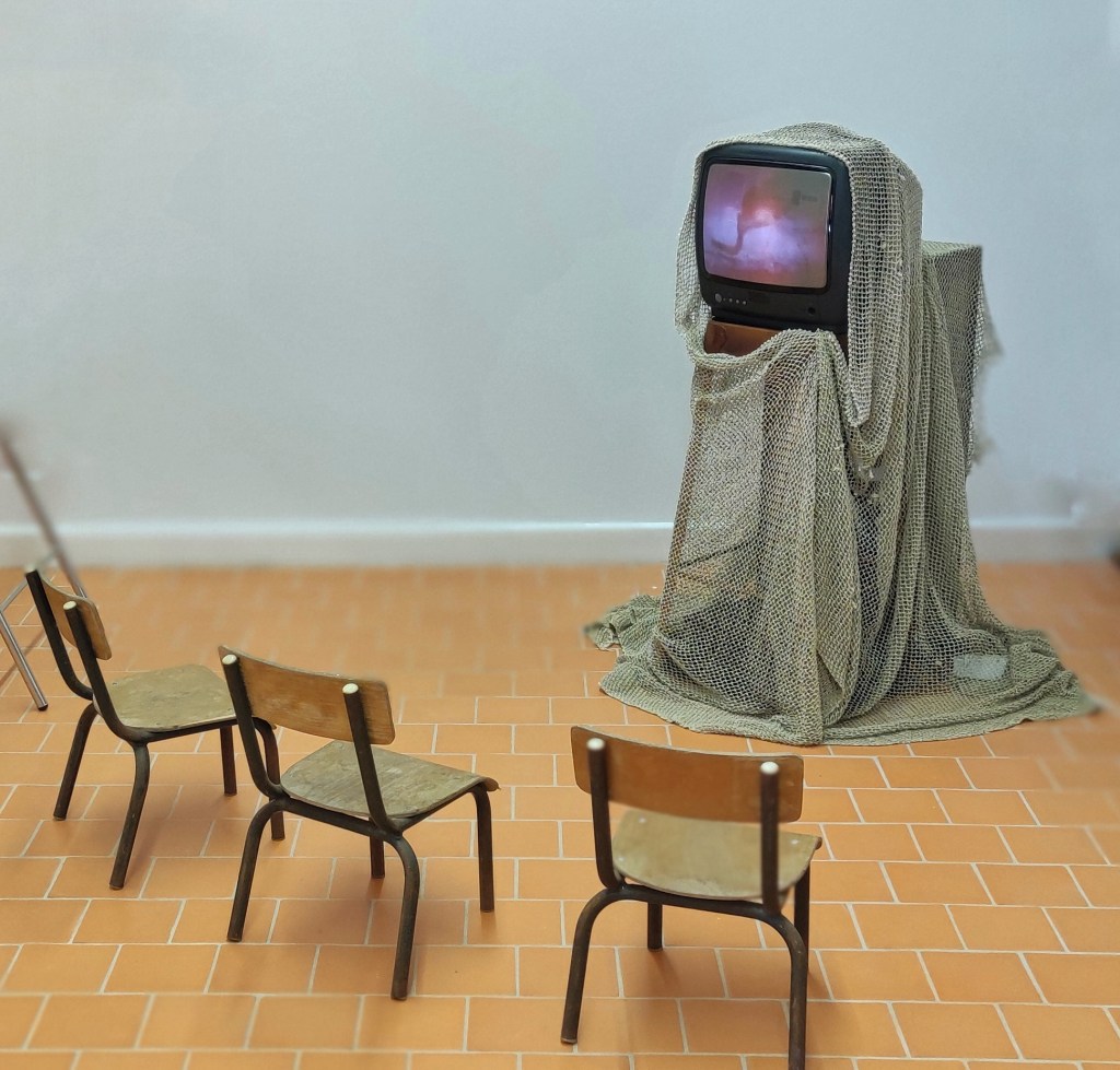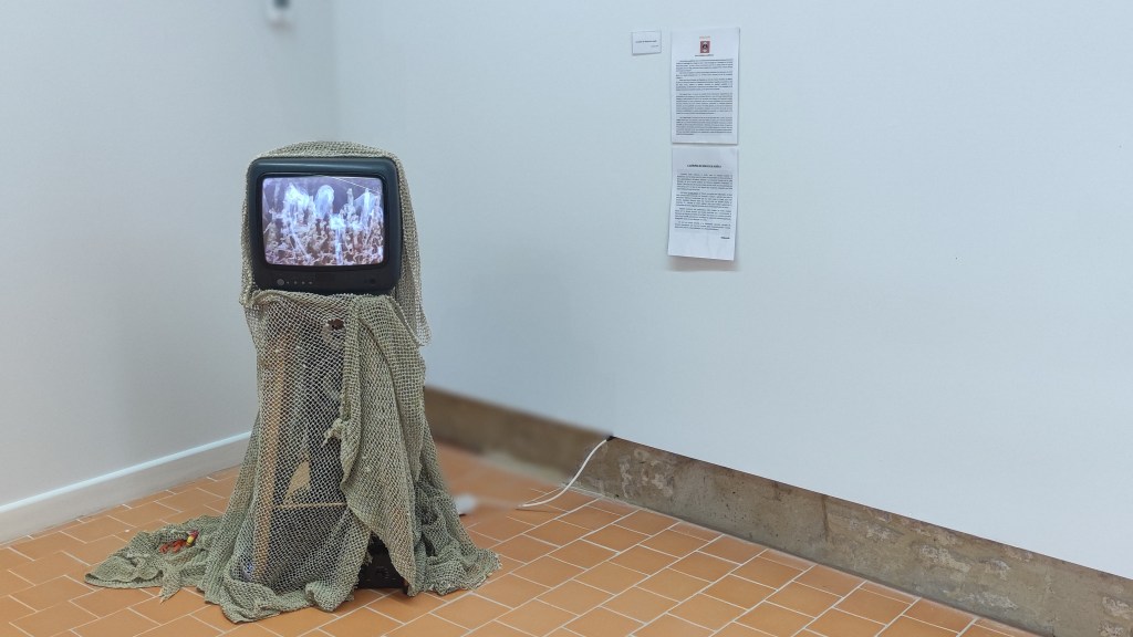 Une installation : comment matérialiser ce qui remonte des abysses ? Plastiquement, ils diffusent l’ensemble sur un vieil écran cathodique à l’allure évocatrice d’un scaphandre mémoriel qui nous connecte à une esthétique abyssale. L’installation figure l’agrégation, non pas de lettres, mais de l’être transformé par les flots abyssaux, et le mythe revisité par l’imaginaire vidéographique des DiAgnostik : une chimère, composée de petits bouts de lectures mis bout à bout pour former un collage inattendu.
